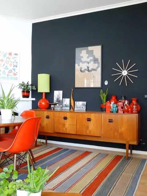 Just look at how the colors from the artwork, accent pieces and rug just jump out at you in this beautifully designed living room. The black wall is the perfect backdrop!