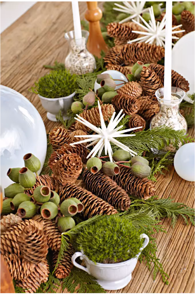 Bowls of pinecones, driftwood centerpieces, or hand-thrown ceramics connect us to the tactile beauty of the earth. Start with your own backyard and make it a family affair by sending everyone out to collect an item or two that reminds them of the holidays.