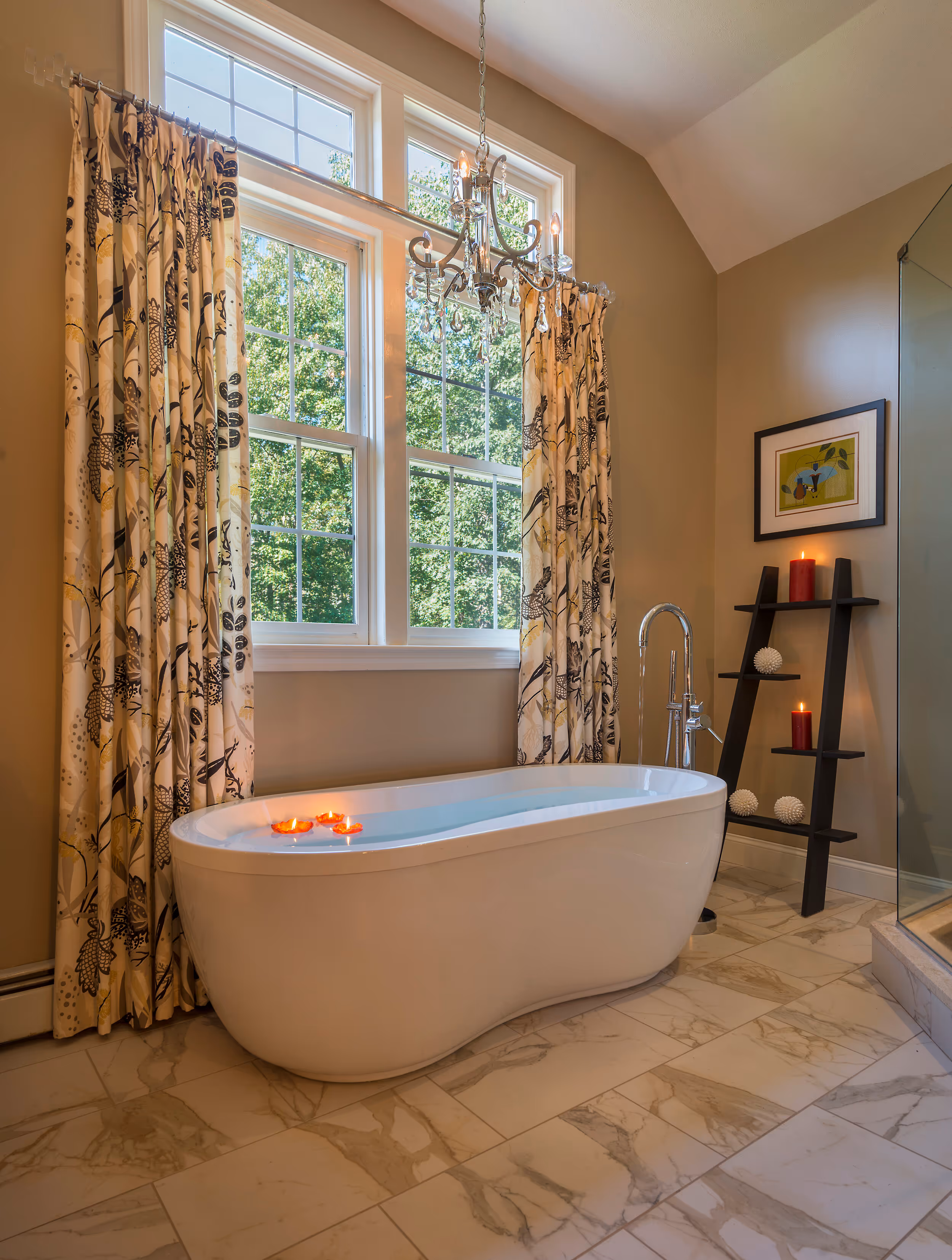 While I could write a whole blog on sexy bathrooms, here's a peek at one our favorite romantic retreats for two. We added a touch of tenderness to this master bath by creating both a curvaceous tub and shower for two. Look closely and you will see that the center ribbon in the tile follows the sinuous curves of the tub (and maybe even an occupant :))