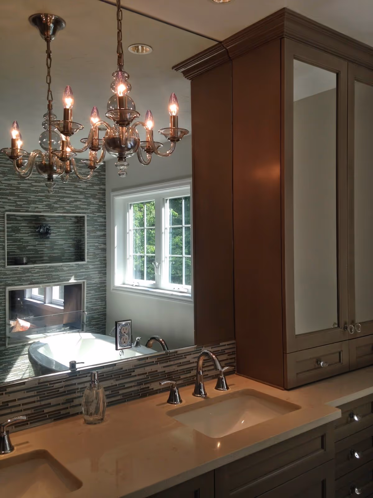 Vanities and lighting can really date a bathroom. I am sure many of you reading this post have or have had these types of lights above at least one of the vanities in your home. My clients were looking for a more sophisticated look, so we added a chandelier and custom cabinets.