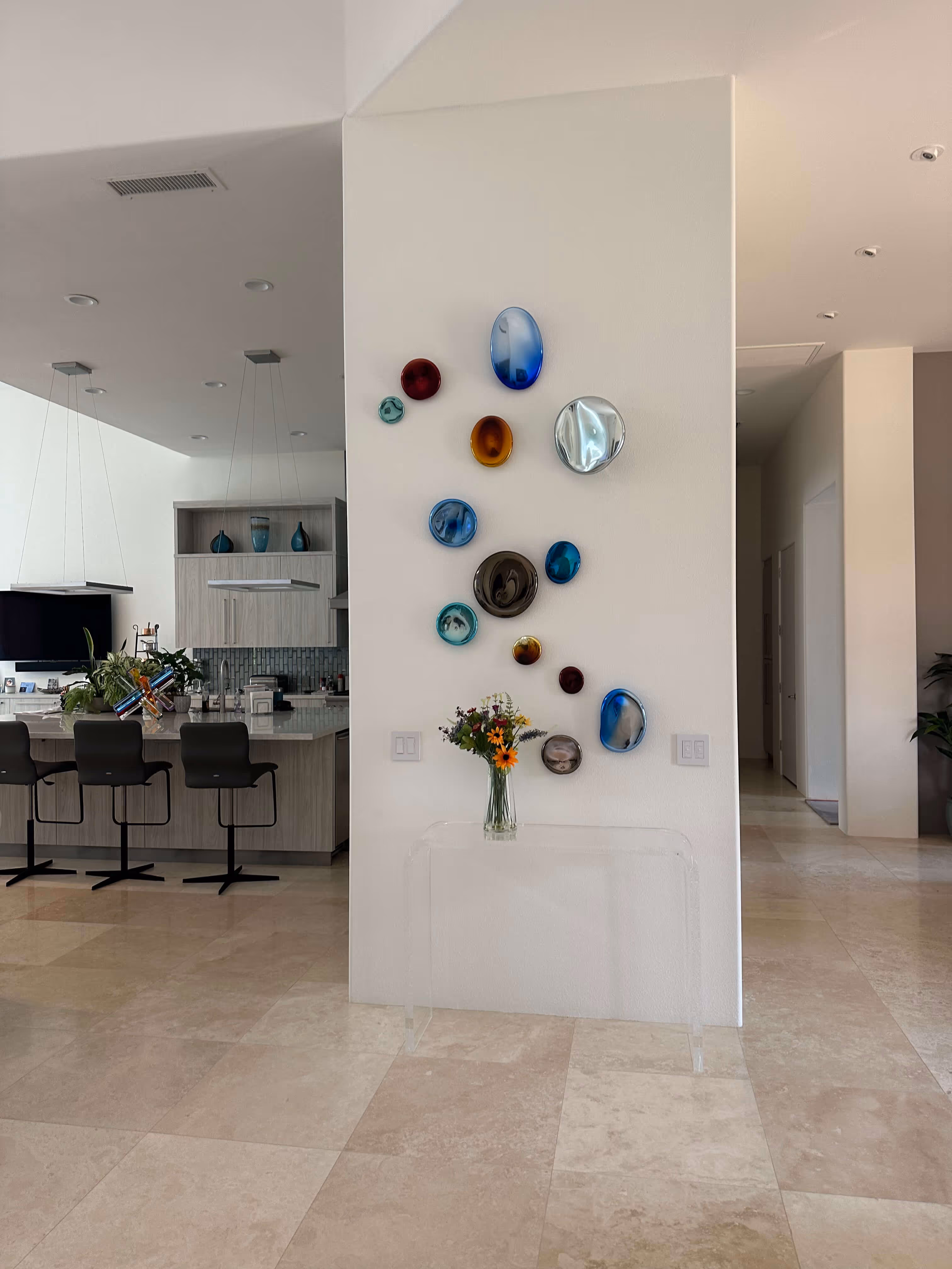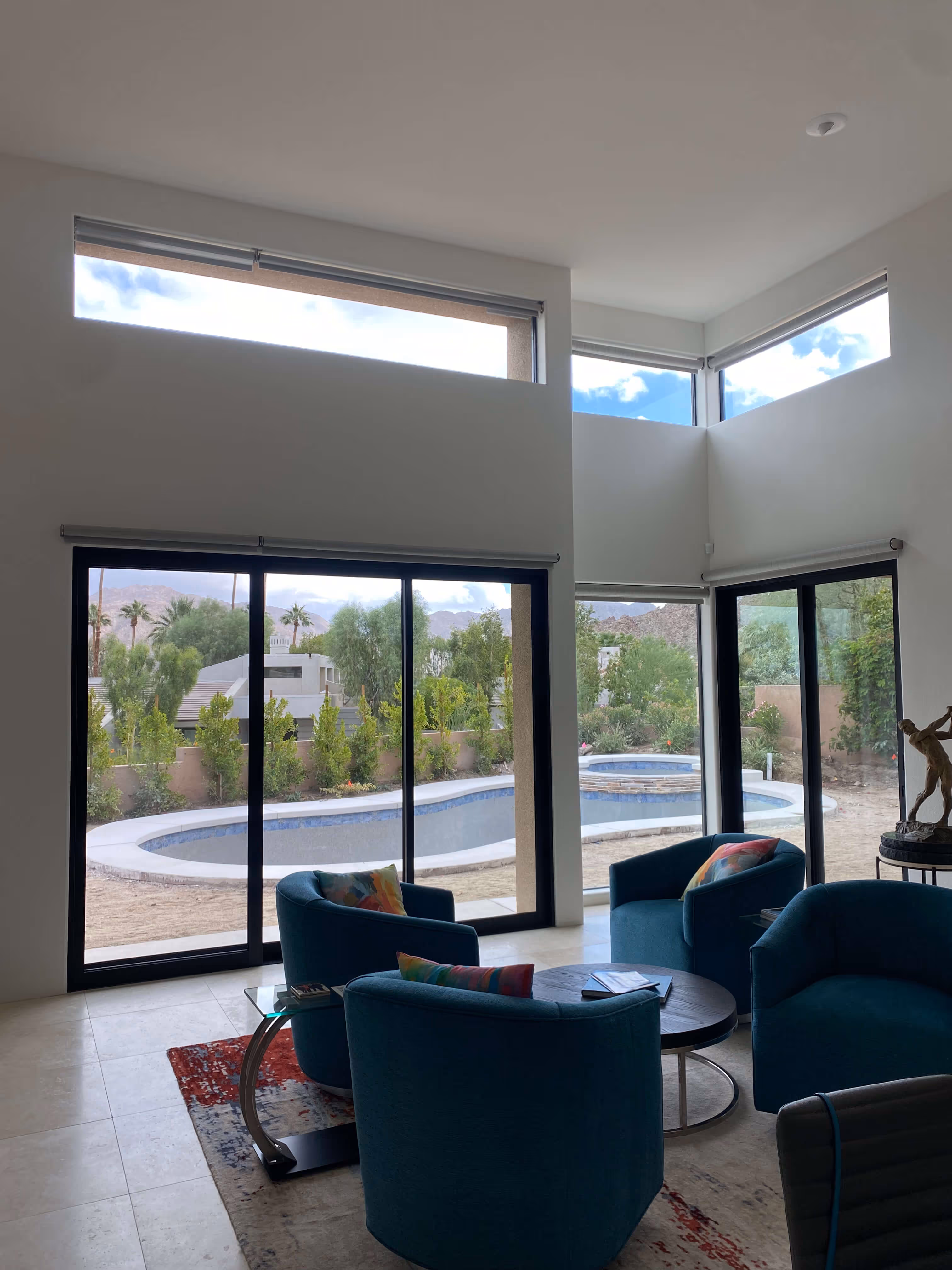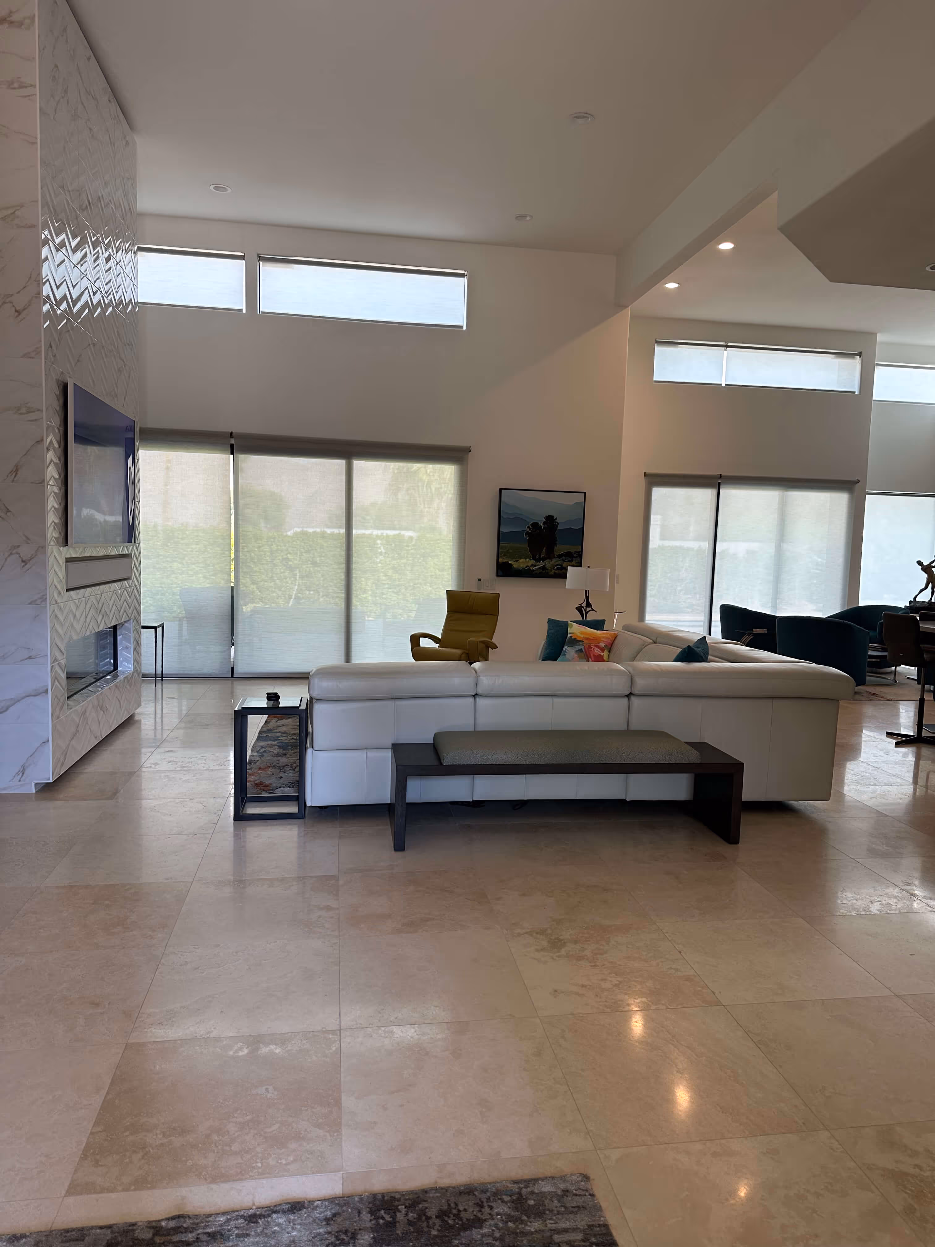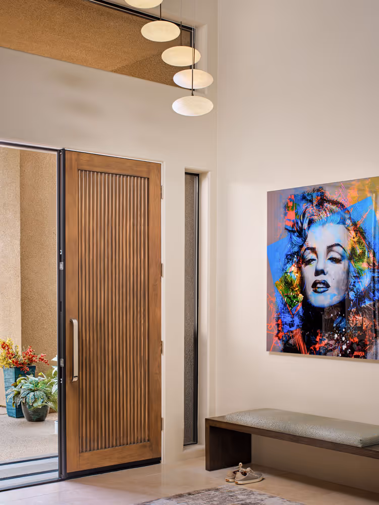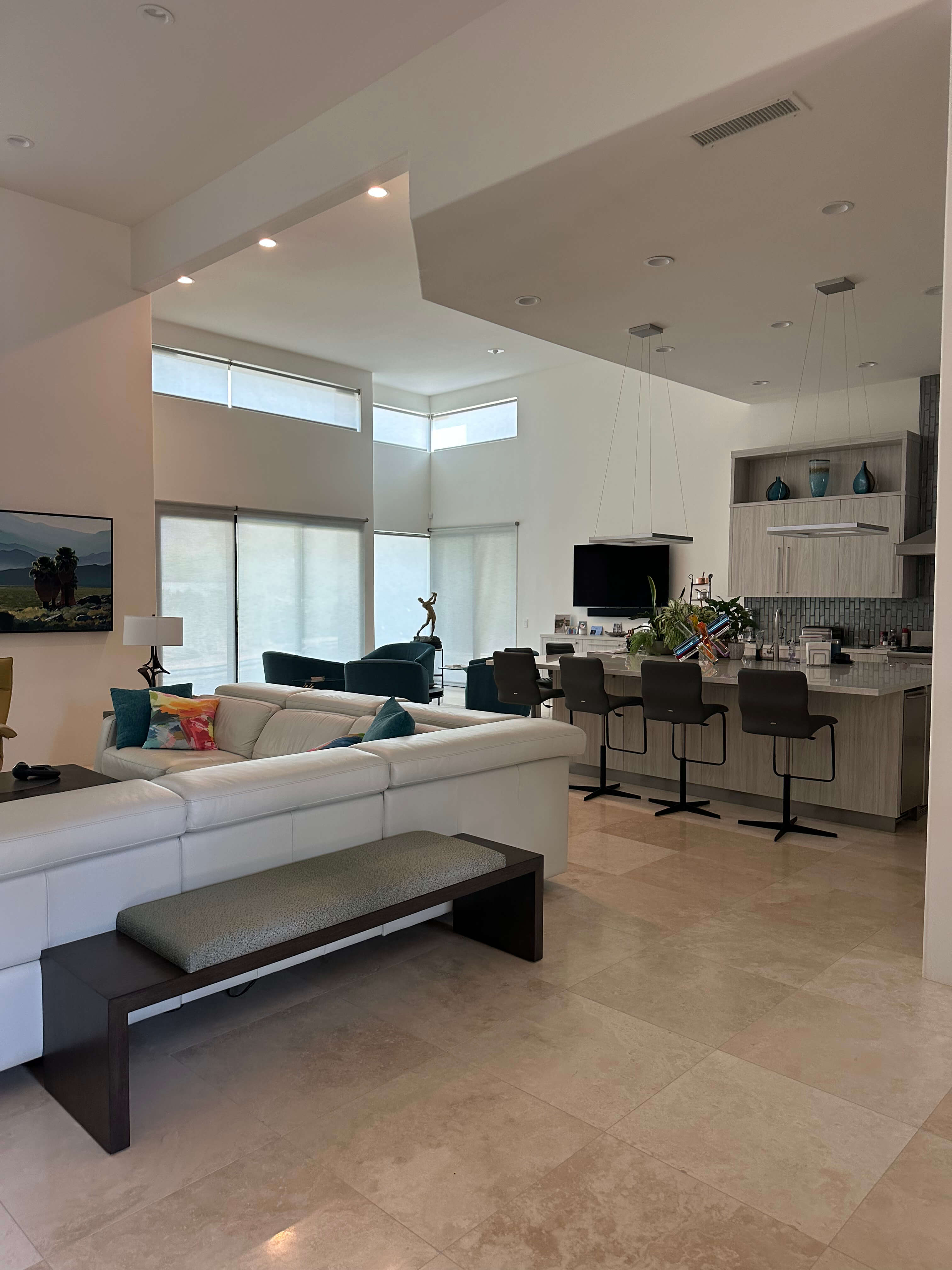 Located in Palm Desert’s Ironwood Country Club, The Crosby House presented a dramatic architectural canvas with soaring ceilings and gallery-like white walls. The goal was to transform the space into a warm, livable home that celebrated the homeowners’ love of art and film icons while creating a more intimate atmosphere.